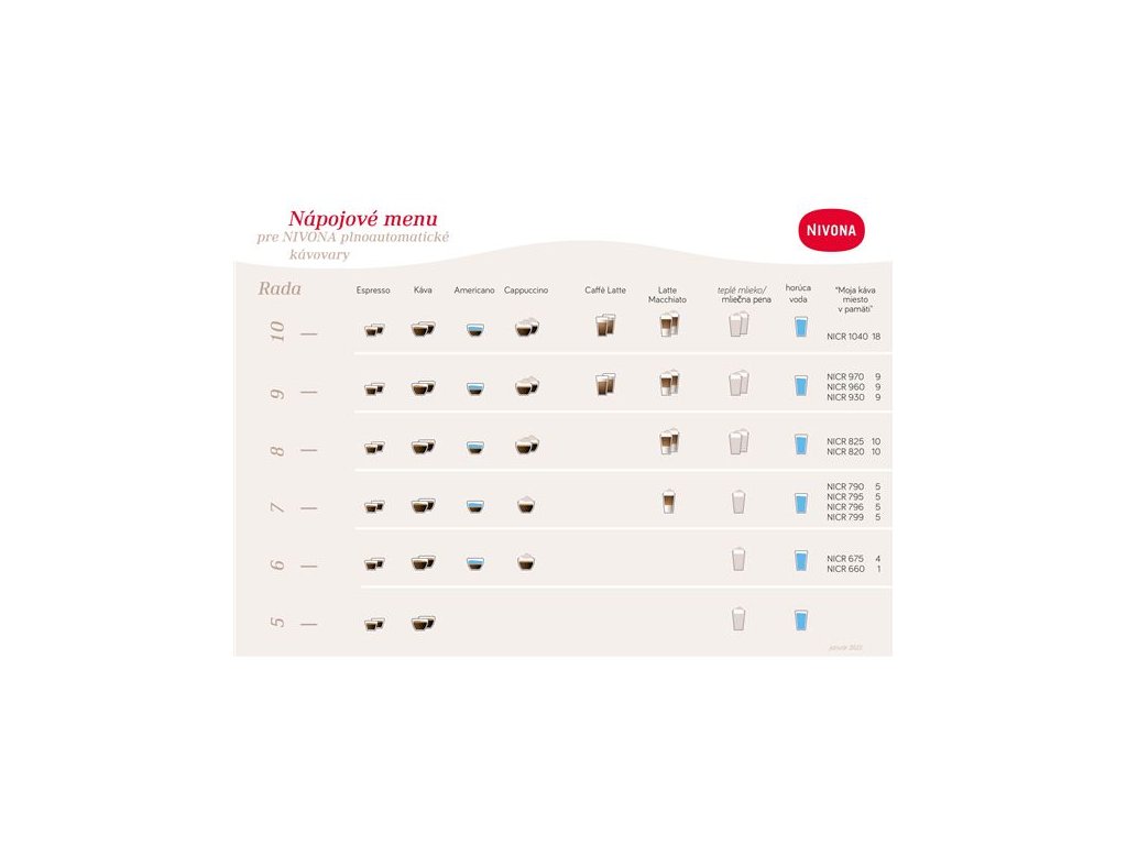 Kompaktné. Jednoduché. Rýchle. Pre jedinečný pôžitok z kávy. Objavte teraz nové modely radu 5. Ideálne pre čerstvo namletú kávu – každé ráno. Teraz so známym konceptom ovládania NIVONA v novom farebnom TFT displeji. Optimálne pre všetky nastavenia kávy a espressa. S automatickými čistiacimi programami pre jednoduchú údržbu. Ušetríte nielen čas. Zažijete komfort v základnej triede plnoautomatických kávovarov Nivona. Rovnako ako u všetkých modelov s odnímateľnou varnou jednotkou. Kompaktný pôžitok z kávy.